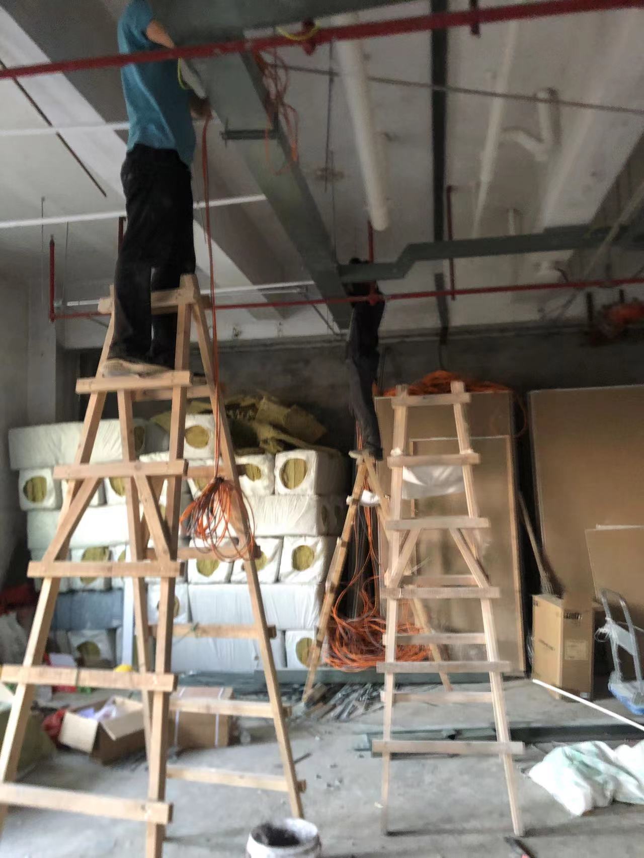 马龙小区改造施工现场,现场施工情况,拉线,做桥架