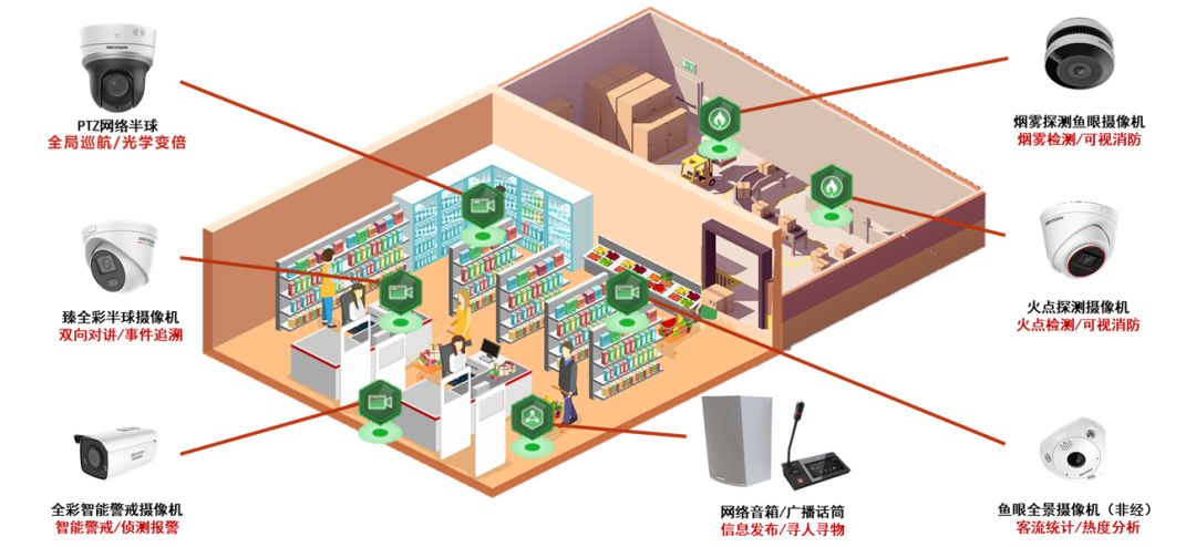 同时,在商店内部可安装IP网络音柱及广播话筒,在日常经营活动中播放促销广告、发布信息、播放音乐,还能在有需要时播报寻人寻物启事。