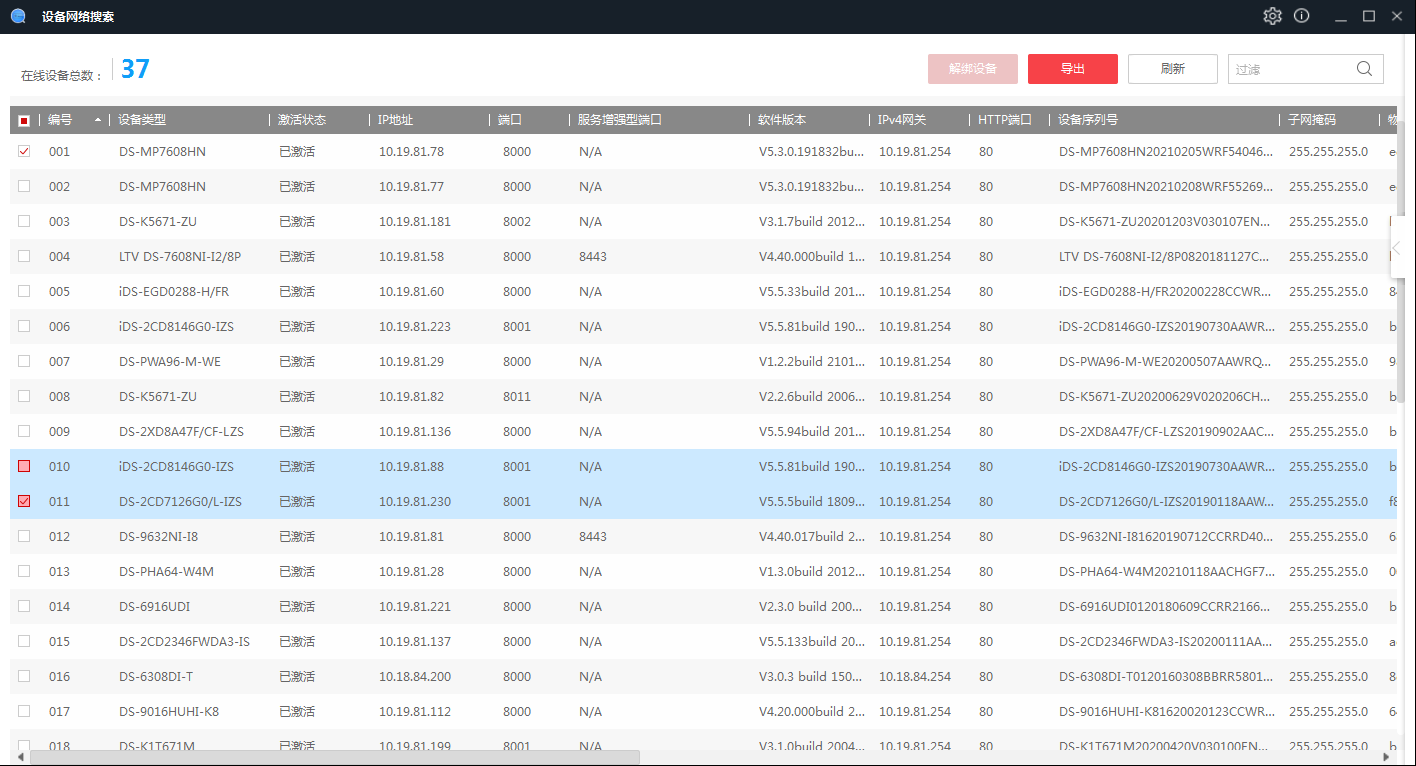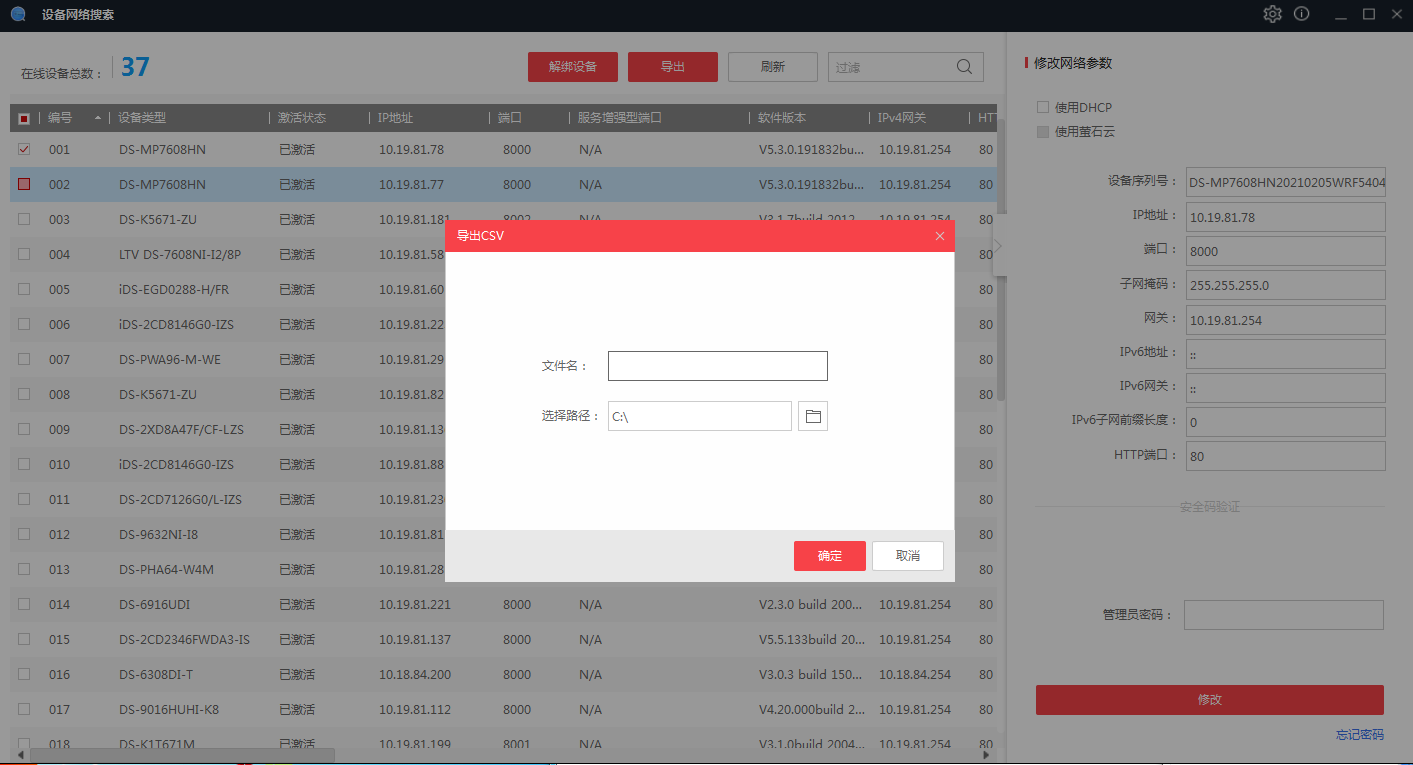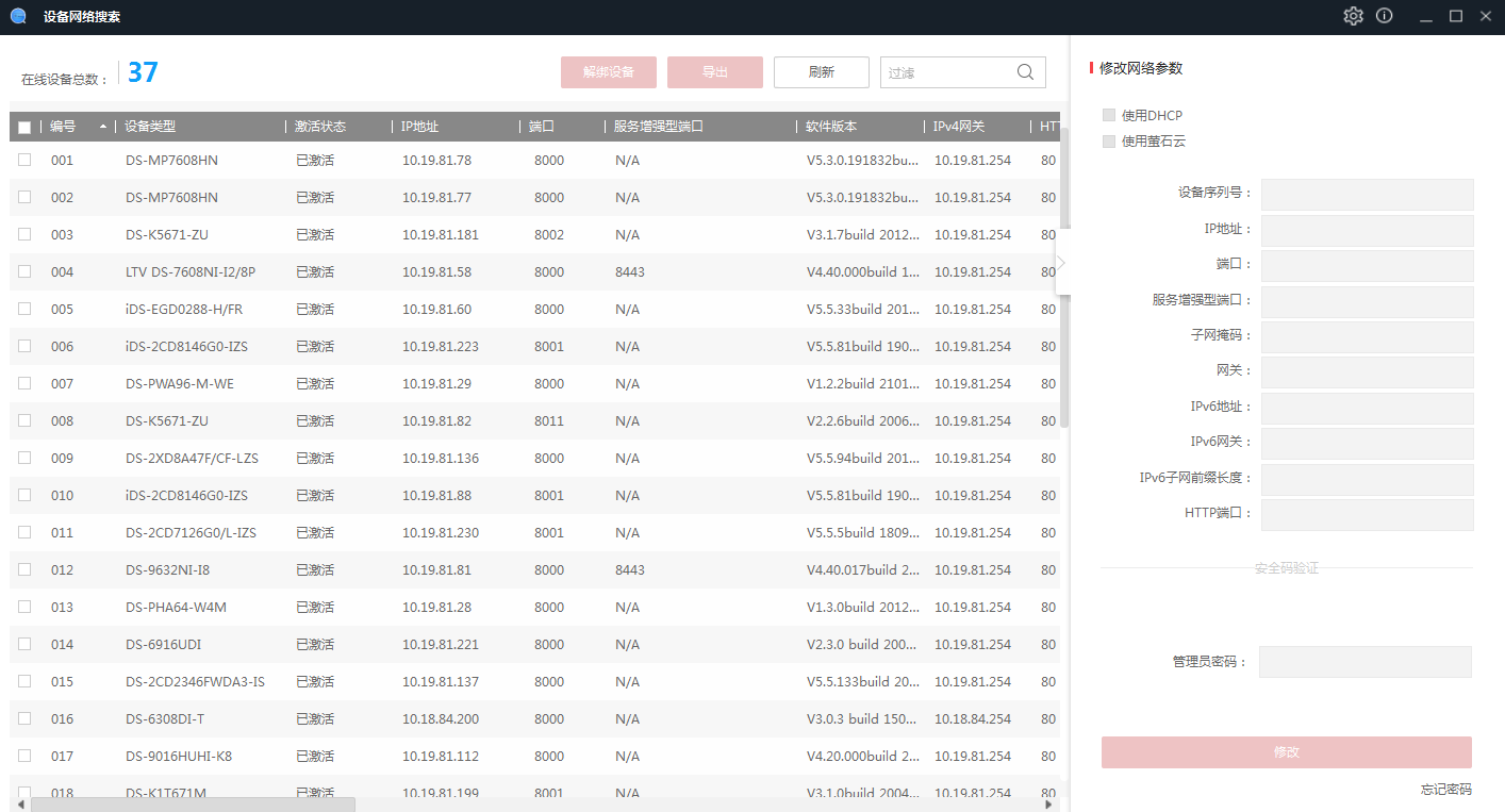 通过SADP软件搜索局域网内所在网段的在线设备。同时支持查看设备信息、激活设备、修改设备的网络参数、重置设备密码等功能